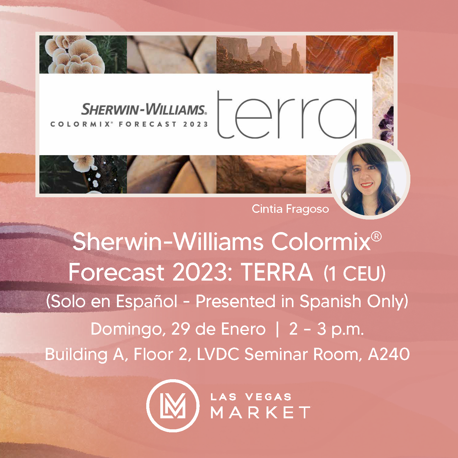 Las Vegas Market & Sherwin-Williams invite you to this exclusive presentation with Cintia Fragoso, Color Specialist with Sherwin-Williams, for the presentation of the 2023 Colormix® Forecast: Terra, presented in Spanish only for this market. Attendees will receive the exclusive Sherwin-Williams 2023 Colormix® Forecast brochure. This course will take the participant on a tour of the beautiful inspiration, factual statistics and perceptive research that support the 2023 forecast for color and design trends.